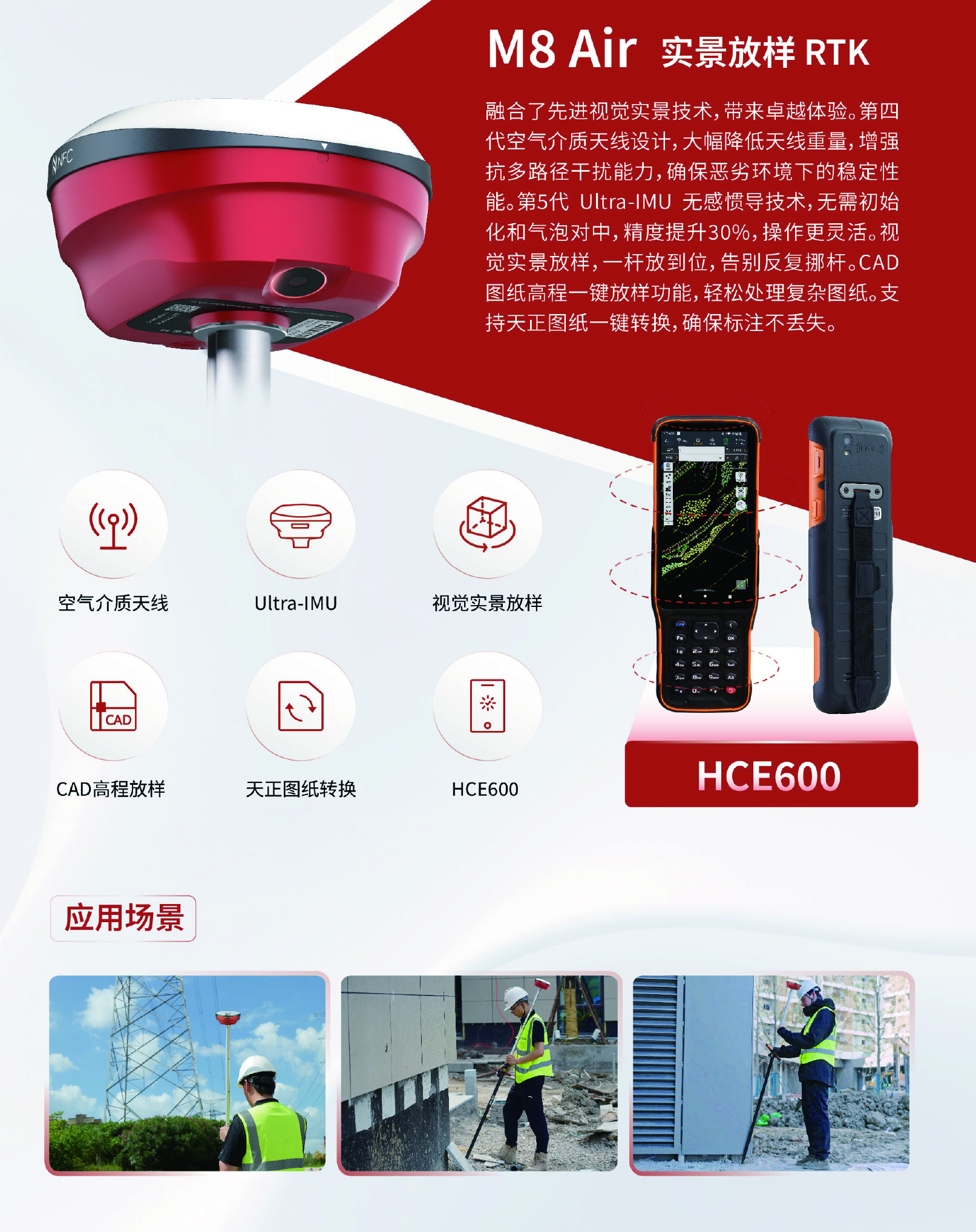 M8 Air 实景放样RTK采用第四代空气介质天线设计,大幅降低天线重量,增强抗多路径干扰能力,确保恶劣环境下的稳定性能,第5代Ultra-1MU无感惯导技术,无需初始化和气泡对中,精度提升30%,操作更灵活。